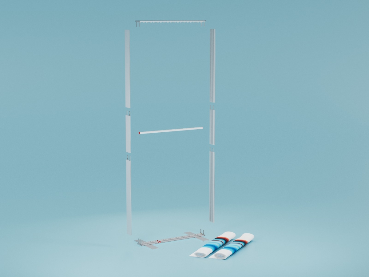 Nehmen Sie die einzelnen Bauteile einfach aus dem praktischen ABS-Koffer, setzen Sie sie zusammen (kein Werkzeug erforderlich), schrauben Sie die Füße an – und schon ist das System einsatzbereit! Die Drucke mit angenähten Silikonkedern lassen sich mühelos am System befestigen, sind benutzerfreundlich in der Handhabung und können jederzeit rasch und einfach ausgetauscht werden.