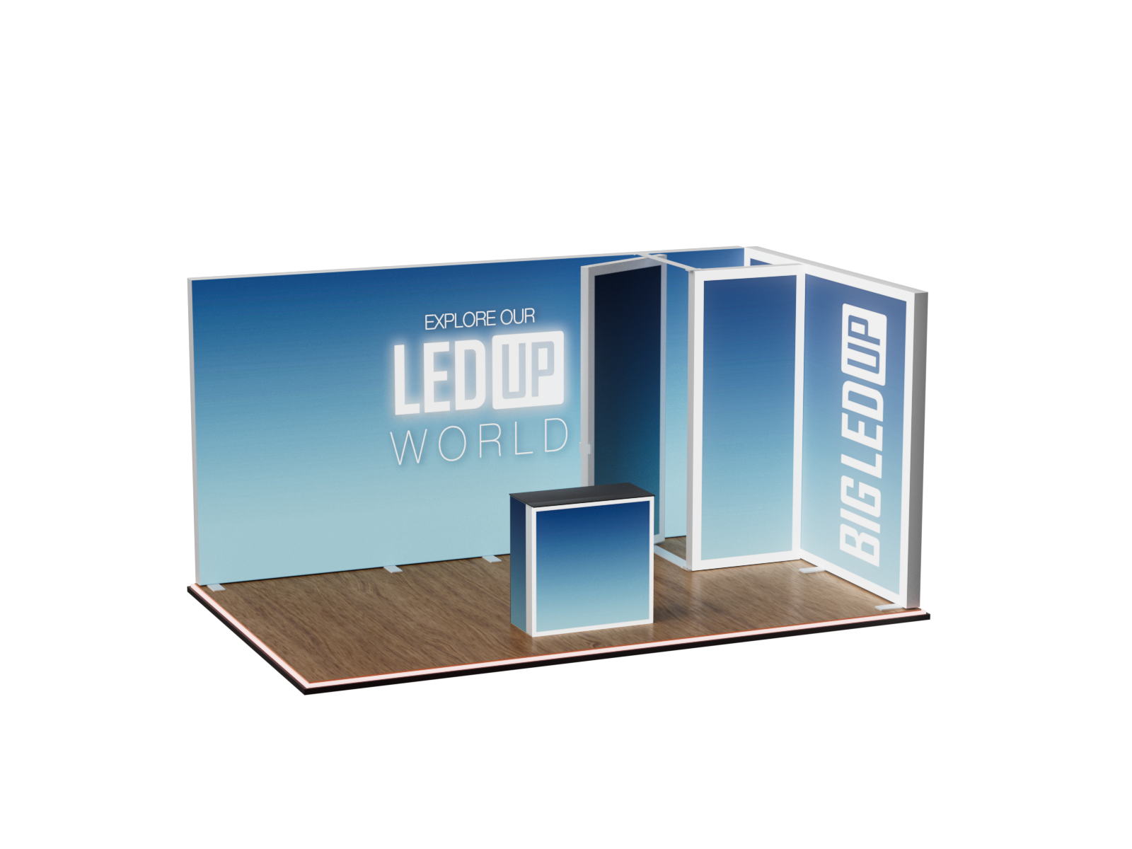 With a footprint of 5x3 m and a height of 248 cm, as well as a Counter ONE and a booth, this set is designed for those who need an impressive and professional exhibition stand. This modular set offers maximum flexibility and allows you to adapt the setup to your specific event requirements. Whether for trade fairs, conferences or any other promotional event - the BIG LEDUP Set 5x3 DEVON ensures that your brand stands out with clarity and style.